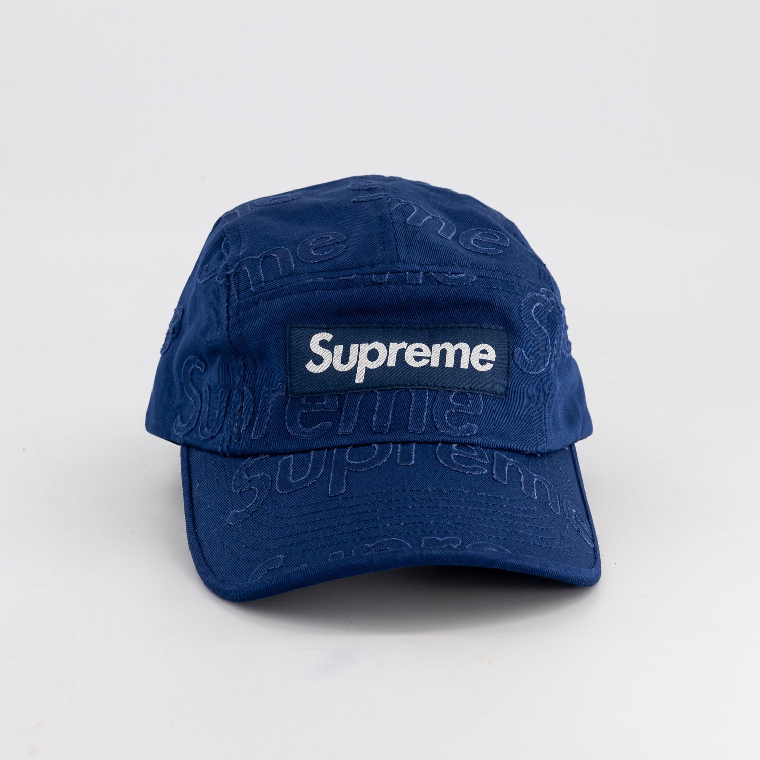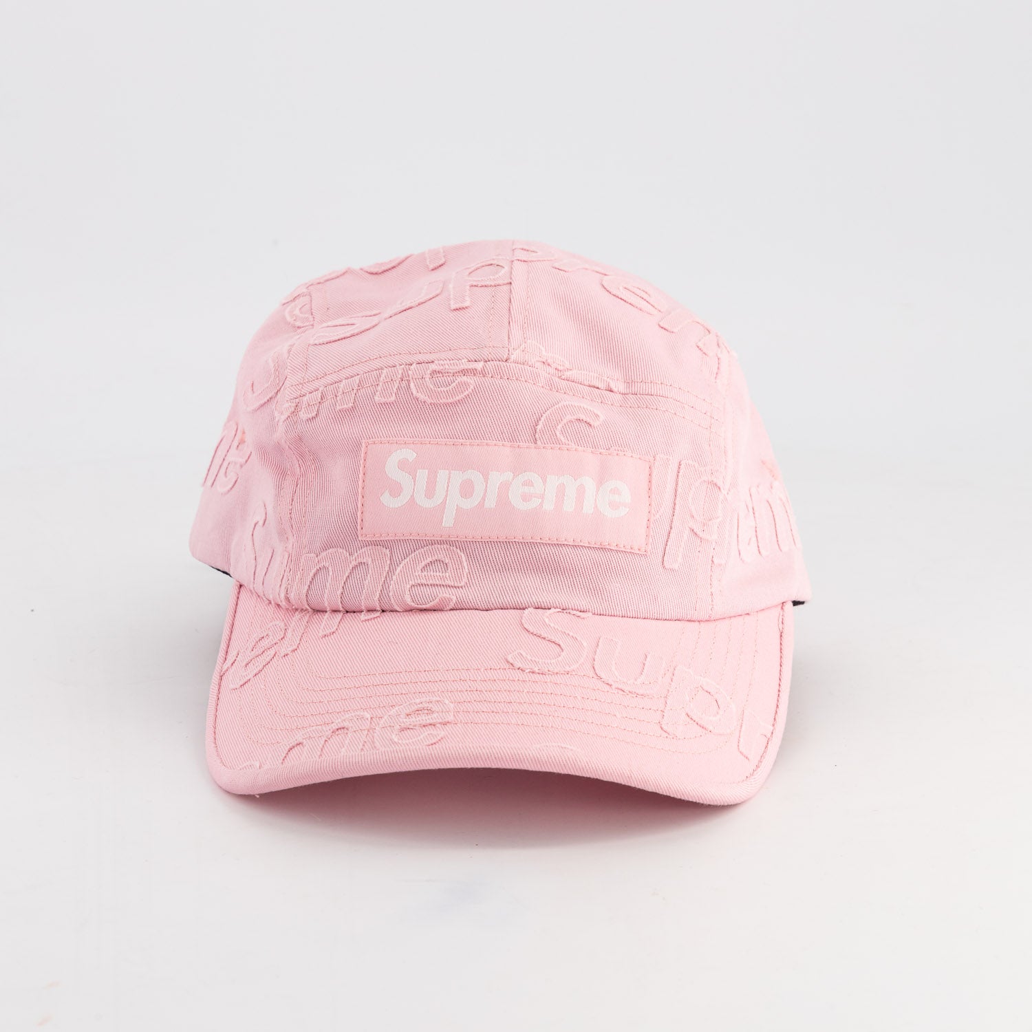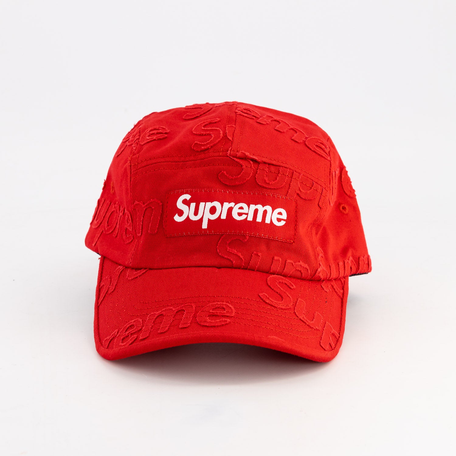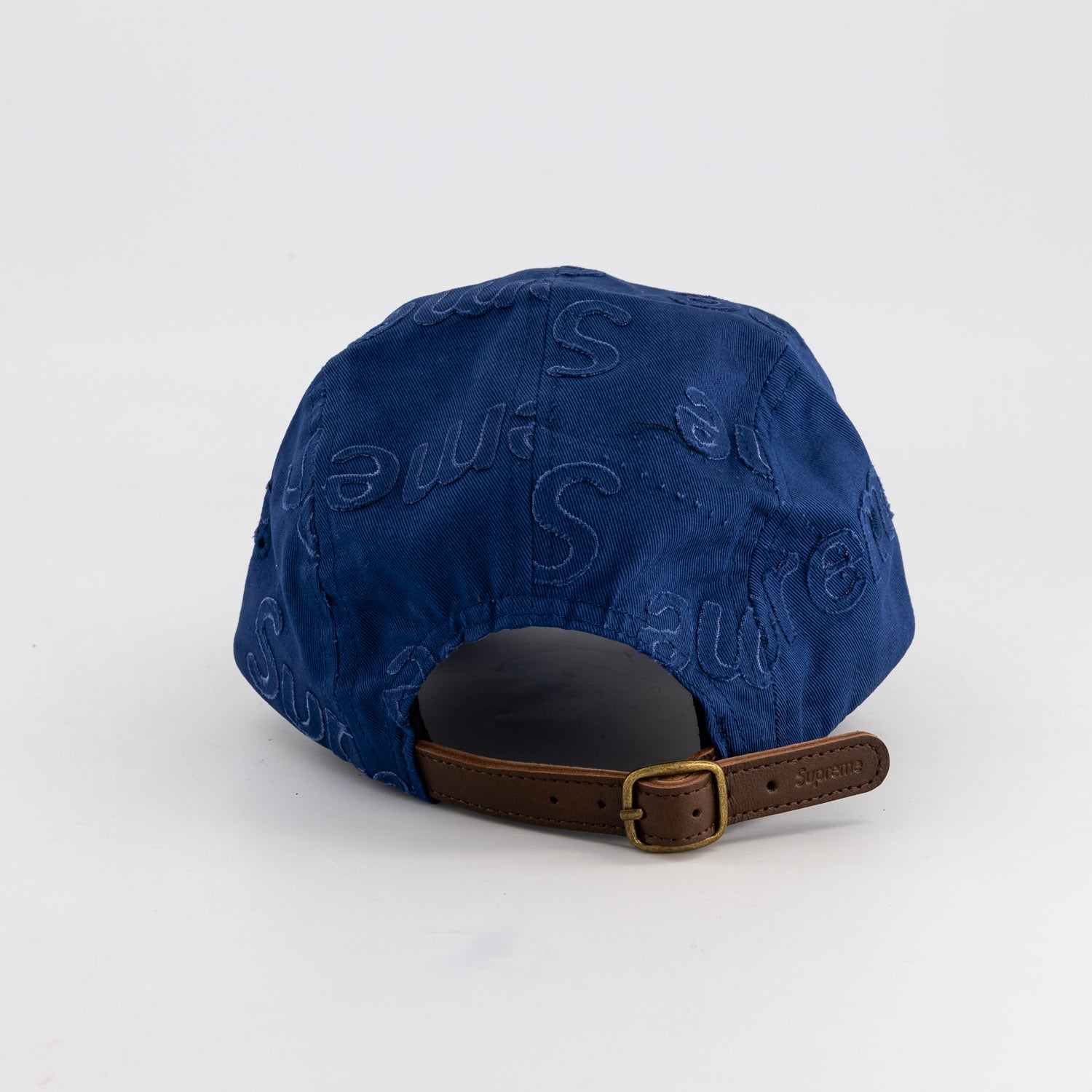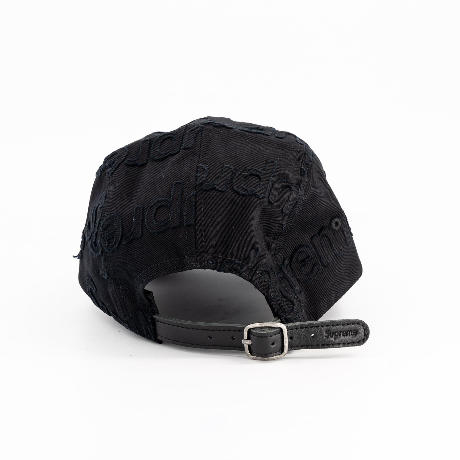 All cotton twill Supreme camp cap with lasered logo pattern and custom debossed leather strap closure.