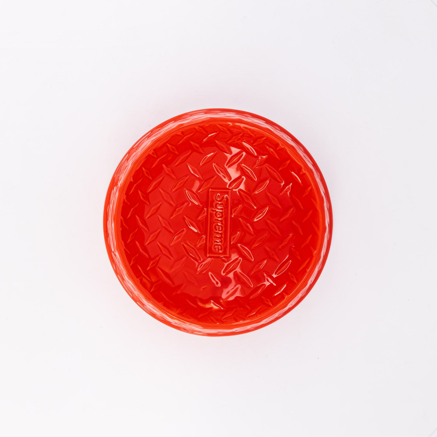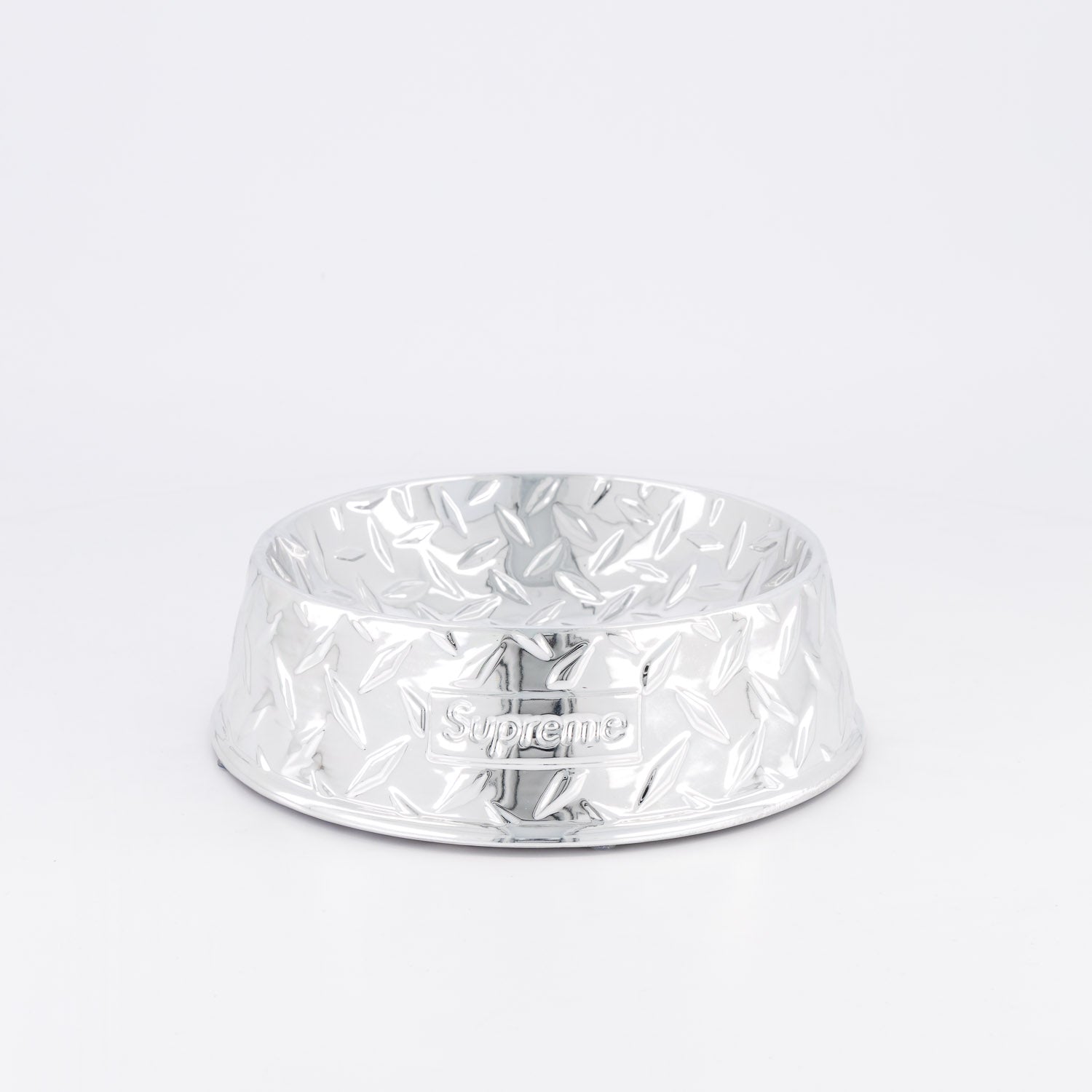 Ceramic dog bowl with molded pattern and embossed logos. 7".