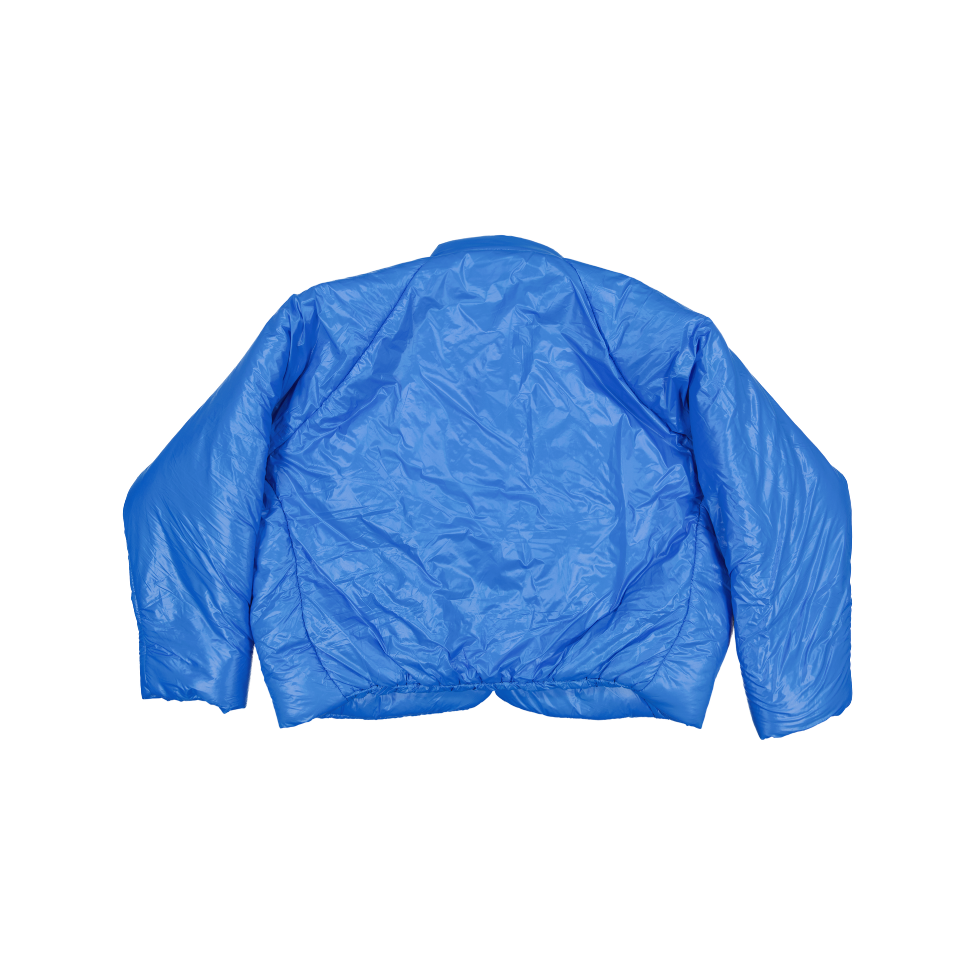 Kanye West was photographed wearing the jacket for the first time just days before its release, which came ahead of the larger Yeezy x GAP full collection. The jacket gives off a round shape and features no branding other than a Yeezy x GAP tag on the inside neckline. This blue color is apparently Kanye West's least favorite color.